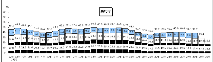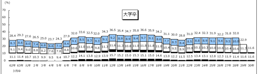 上記画像の一番上の数字が「三年未満に辞めた人の割合」を表しています。